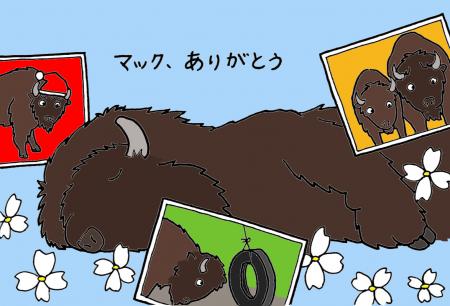 8月4日の早朝、アメリカバイソンのオスの「マック」が静かに息を引き取りました。享年23歳8ヶ月でした。23歳はアメリカバイソンでは高齢で、最近では朝、室内で座り込んでいることもあり、体力が落ち込んでいるようでした。それに加えて、このところの夏の暑さがさらにマックの体力を奪ってしまったのかもしれません。8月2日の午後3時ごろ、マックは突然放飼場で横に寝転んだまま起き上がれなくなってしまいました。起き上がれなくなったマックを飼育担当者のほか急遽集まったスタッフ何人か力を合わせてなんとか起き上がらせようとしました。角にロープを掛けて引っ張り上げたり、地面と身体の間に木材などを挟んで角度をつけて起き上がりやすくさせたりしました。しかし動物園の閉園の時刻が過ぎても、まだマックは起き上がることができませんでした。日がだいぶ傾いてきたとはいえ、真夏の炎天下で、暑さはまだまだ厳しいものでした。そのため、マックにはホースで霧状の水をかけてあげてなんとかこれ以上体温が上がらないようにしました。午後5時過ぎになってようやくマックは自力で起き上がることができ、その足で自分の寝室へと戻っていってくれました。なんという生命力でしょうか。よく頑張ったぞ、マック。部屋の中でいつもどおりご飯を食べ始めてくれたので、その日は様子を見ることにしました。しかしこのときすでに、もうマックの体力が限界を超えていたのでした。次の日の朝、マックは寝室の中で再び立ち上がれなくなってしまいました。もう三度(みたび)立ち上がる力は残っていませんでした。横になったマックの口元へ大好きなニンジン、サツマイモ、リンゴを持っていってやりましたが、もう食べることは出来ないようでした。その大きなつぶらな瞳はもはや大好きな食べ物を追うことさえ出来なくなっていました。私はこの時、もうマックとお別れをしなければならないんだと感じました。まだあきらめきれない気持ちの中に目の前の悲しい現実が心の中に割って入ってきました。高齢だったとはいえ、まだマックにしてやれたことはあったはずでした。ごめん、マック。