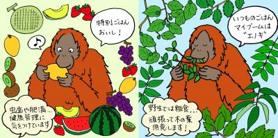 こういったご寄付事情から、やはり世間ではオランウータンはじめサルの仲間の食べ物といえばフルーツ(果実)というイメージを持たれていることが伺えます。しかし、実のところ野生で暮らすサルの食事はだいぶ異なります。果実は年中手に入る食べ物ではありませんし、野生の果実は、私たちが食べている品種改良された果実(栽培果実)とは栄養価が大きく異なります。栽培果実は、もともと実にため込むはずだった食物繊維やタンパク質、脂質の代わりに甘い糖分を貯め込むように品種改良されているのです。ですから、動物園で栽培果実を与えすぎれば糖尿病や虫歯にまっしぐらです。何事もほどほどが肝心ってことです。また、ボルネオオランウータンは非常に太りやすいことで知られています。