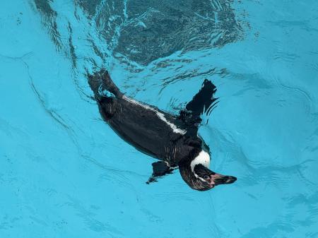 2羽が落ち着いて行動できるよう、巣箱の中はお客様から見えないようにしていますが、ごはんの時間にはシンタかミールのどちらかがプールで魚を食べる姿がご覧いただけるかと思います。