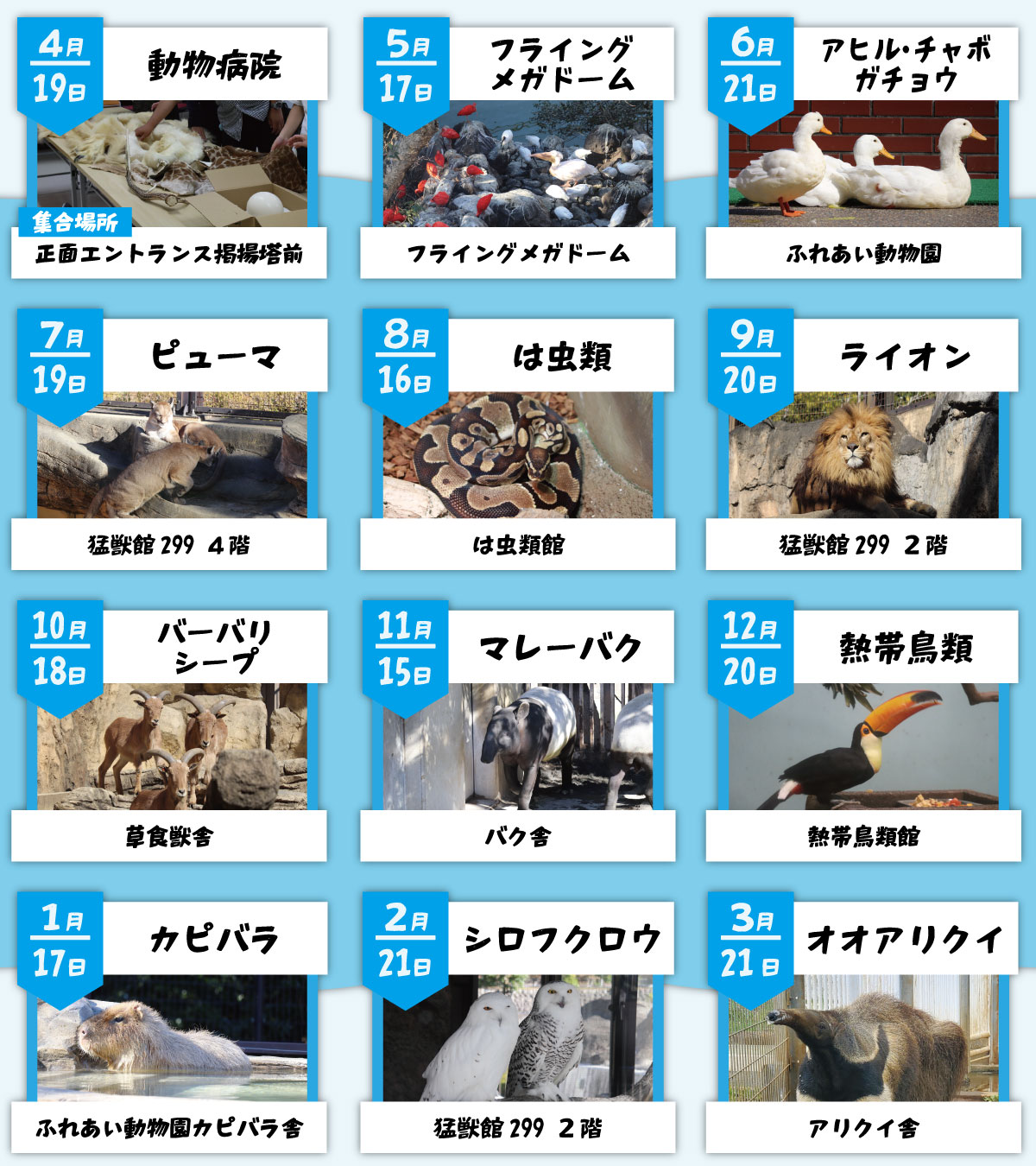 ※イベントは動物の体調や天候などの理由により内容が変更となったり、 中止となる場合がありますのであらかじめご了承ください。