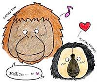 平成15年10月27日ボルネオオランウータンのメス(愛称キャンディー)が京都市動物園より来園しました。当年取って25歳人間で言うなら30から40歳ぐらいかな。新婦のお相手は、当園生まれの21歳の気は優しく器量よしのオス(ジュン)。オランウータンの国内での繁殖は少なく、ここ10年間で2頭と大変希少な動物です。また、海外からの導入は法律改正により極めて困難な状況です。その法律改正の背景には、人畜共通感染症の病原体の国内侵入防止の強化によります。この法律改正により霊長類(サル関係)を輸入する場合輸出国での検疫、輸入の際での検疫などを含めると数ヶ月の検疫期間が義務付けられ動物にとっては想像を絶する過酷な日々なのです。数年後可愛い赤ちゃんをご披露できるようスタッフ一同頑張っています。