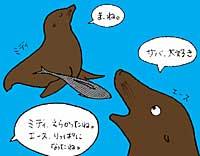 そうして順調に大きくなってきていたエースを含め彼らの担当に私がなったのは、昨年10月でした。ご存じのようにアシカは私たちと同じ哺乳類、下腹の所に4つ乳頭があり、お乳を飲んで大きくなります。そして半年を過ぎる頃から離乳が始まっていきます。私が担当になった時期はまさしくこれから始めようかという時期でしたし、お母さんの気まぐれで突然育児放棄したらどうしようかと不安がありました。しかし、新米の私に対しても、グリアンもミディも普段どおりに接してくれ、ミディはエースに対してもお乳を与え続けてくれました。