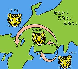 アムールトラは希少種です。しかし、国内での繁殖がなかなかうまくいっていないので、「子供たちを是非うちの園に!」というオファーがいくつもの動物園から来ました。最初に、長野市茶臼山動物園にスルガが行くことになりました。このために、ナナと子供たちを分けることにしました。夕方の入舎の時に部屋を分けると、普段は餌をすぐに食べる子供たちが、ナナの部屋を気にして餌を残す程でした。