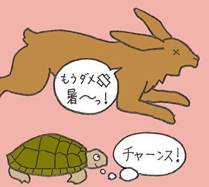 昔話「ウサギと亀の競争」では僕の仲間が途中で昼寝をしたから負けてしまったけれど、ホントはね一生懸命走ったら体が熱くなって動けなくなっちゃたみたいだよ。後、時々震えているって言われるけど、暑くてすごくハアハアしているからそう見えるんだ。