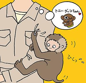 しかし、幼い彼の行動は成功ばかりではなく、勢いをつけ過ぎて滑って転んだりとお茶目なところものぞかせるが、日を重ねる事に容姿は一人前にシシオザルらしく、顔の両側はねずみ色の縦髪が少しずつ伸びてきて、下アゴあたりからのどと首にかけても同じく生えてきて立派なものであり、たくましくも見えてくる。