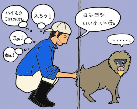 そんな中この度の担当替えにて久しぶり(20年ぶり位)に、また中型サル舎を私は受け持つ事となりました。中型サル舎は園に入ってすぐの所で、ニホンザルやシシオザルといった中型サイズの猿を飼育している獣舎です。以前担当していたとはいえ、1~2頭を除いてほとんど全てと言っていい程、当時実際に世話をしていた子達ではありません。どんな具合かな~と昔の感覚を思い出しつつ、この4月から世話をしていたのですが、あろう事かここに居ましたしっかりと・・・(泣)。マンドリル(♀)のマロンちゃん、あなたデス、あなた!! 扉を開けてもウンともスン。いっこうに寝室に入ってくれません。前担当者に寝室に入れるコツを聞くと、柵ごしにお尻を触ってあげて、本人が納得するまで長い間、という、とにかくそういう事らしいのです。そこでこちらも檻の前にしゃがみ込み、こちらに向けるお尻を「ハイハイ、ヨシヨシ、良い子良い子」などと甘い言葉でなだめつつ、ハイもうこれでよし入ろうと心の底から説得するもむなし。またその内に高い方へ登っていってしまったり・・・そんなこんなの心が折れる日々を数日間繰り返し、それまでは何とかダマしダマし寝室へ入れていたのですが、その日は一向に中に入ってくれる気配なし。寝室へつながる通路から見える手前の所に大好物のバナナを置き、こちらがじっと我慢の子。静かに様子を伺っているとマロンちゃん、周囲をキョロキョロそーっとホフク前進のごとく通路内に入っていき、よしやった入ったァと急いで扉を閉めようとするも早いのなんの。バナナを握りしめ一目散で外の放飼場へ飛び出し木の上に登り、あー危なかったやれやれと、成し遂げた感一杯の表情で美味しそうにバナナを頬張ってくれました・・・。ここでもうこちらの堪忍袋が完全に切れ、やっきりしたのでついにその日は一晩中外の放飼場へ出しっぱなし、閉めだしてやる事としました。