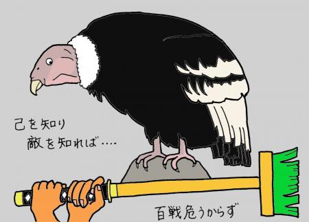 この週のますみちゃんは、いつにもまして、目がランランと輝き、おり越しでも、私を見つけると寄ってきました。「待ちきれない」とでもいうように、首を上下に振り振り、落ちつかなげに歩き回る始末です。すっかり、楽しいおもちゃ認定されてしまった私に対し、まわりの人々は「とにかく無理はしないで」と言います。つまり、ケガするくらいなら、掃除はしなくて良いよと言ってくれているのです。扉を開けるたびにますみちゃんは、おもちゃである私に近づこうとしてきて、全く掃除になりません。こちらも1度噛まれるとすっかり怖くなってしまっています。だって、次に噛まれた時は、今度こそ歩けなくなるかもしれないんです。そんなことになれば、コンドルどころか、ほかの動物の世話も出来なくなって、たくさんの人に迷惑をかけてしまいます。そんな時に言われた「無理しないで」はとても甘い誘惑です。むしろ、無理しないで、といわれているのに、掃除に入ってケガをしたら、2回も噛まれるなんてなんでそんな馬鹿なことをしたんだと言われてしまいます。でも、掃除に入らないと、どんどんコンドルの食べ散らかしたゴミが溜まっていきます。ますみちゃんが困った性格なので、コンドルの部屋だけは、担当しか、奥まで掃除に入らなくてよいことになっていて、掃除をするのは私しかいません。