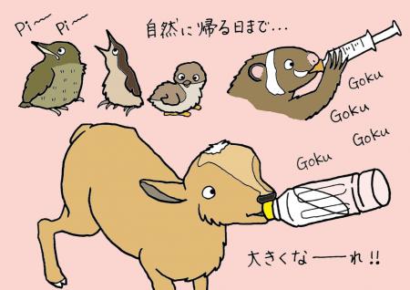 そんなこんなしている季節は春。鳥たちにとっても出産(産卵)と子育ての季節です。…ということはつまり、保護の季節でもあります。特に大雨や強風のあとには、「ヒナが道路にいた」「巣ごと落ちていた」といった理由で保護されたヒナ鳥たちが、たくさん動物病院に運ばれてきます。その他にも、子どもが地面で飛ぶ練習をしている時に(親がこっそり見ているにもかかわらず)、あやまって保護(誘拐)してしまう場合もあります。ツバメ、スズメ、ヒヨドリ、キジバト、カルガモ、セキレイ、フクロウ、オオタカなどなど…。今年は四月に雨の日が多く、ゴールデンウィーク明けも天候が不順で、すぐに育すう室(ヒナを育てる部屋)がいっぱいになってしまいました。巣立ち直前の比較的大きなヒナは、飛ぶトレーニング用に大部屋にみんなで入ってもらい、ケージにもいっぱいいます。朝も夕方も、動物病院の一階は哺乳でバタバタし、二階は「ピーピー」「ギャーギャー」の大合唱です。まさにいろいろな動物の保育園状態。保育士になっている飼育員さんには本当に頭が下がる思いです。でも、保護されたヒナたちがすくすく育って放鳥できた時は、本当に嬉しくなります。ムササビは残念ながら一頭が肺炎で死んでしまいましたが、もう一頭とバーバリシープは順調に育っています。これまで当園では、バーバリシープの人工哺育はなかなかうまくいかないということがありましたが、今では母親たちのいる放飼場に戻り、担当の飼育員さんに毎日ミルクをたくさん飲ませてもらって、少しずつ大きくなってきています。最近は乾草や濃厚飼料も食べるようになりました。