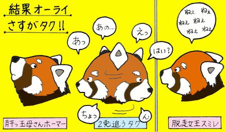 2頭の交尾をずっと柵越しに眺めていたスミレ(日本平の脱走女王)。実はこの時スミレにも発情が来ていたのです。そしてなんと交尾中のタクの背中を柵越しにとんとん叩きだしたのです。スミレもタクに「そんなアメリカ女なんかよりアタイと遊ばない?」なんて誘いをかけたのかもしれません。「おいやめろ!今大事なところなんだ、余計なことすんな!」という心の叫びは無情にも届かず、スミレに目移りしたタクの隙を突いてホーマーが逃げ出しました。今までレッサーパンダが柵越しに対峙しても鼻先を合わせるくらいで、手を伸ばして相手を触るなんてことは一度も見たことがありませんでした。交尾が中途半端に終わり本来なら飼育員として困惑するところですが、現実に2兎追うものは1兎も得ずを見て苦笑いしてしまいました。