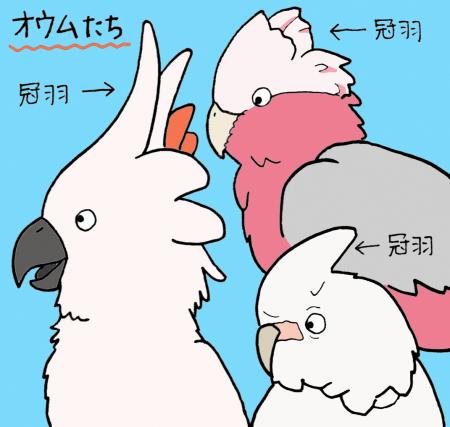 冠羽とは頭に生えている長く伸びた羽のことです。この冠羽は、感情によって自由に動かすことができます。仲間とコミュニケーションをとるのに使ったり、敵に対して体を大きく見せるために使います。インコ舎にいるオウムは、シロビタイムジオウムのビタ、モモイロインコのモモとモイ、オオバタンのマツコがいます。普段は冠羽をとじているのでパッと見では分かりにくいです。運が良ければ冠羽がたっているのも見られるかもしれません。