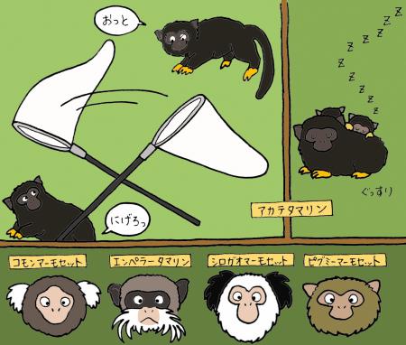 そんなこんなで慌ただしい一日が終わり、その後婿・嫁入りも無事に済み、赤ちゃんたちは現在もすくすくと成長しています。アカテタマリンたちはとても小さなサルですが、そのたくましさには驚かされました。ひよっ子飼育員のわたしもこの小さな同僚たちを見習って、たくましく成長していきたいと思います。