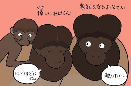 8月下旬のとある日、ジャワがキーマに交尾をせまっていたので、いつものように交尾をするのかと見ていると、キーマが嫌がりその時は交尾が成立しませんでした。すると翌日から、少しずつジャワの様子に変化が現れました。警戒心が強くなり、放飼場に入って来た飼育係に対して激しく威嚇したり、手を出して攻撃したりしてくるようになったのです。同居していた第4仔のクミン(メス)も似たような動きをしてきます。明らかに様子がおかしいのでよくよく見ると、キーマのお腹が少し大きくなっているようでした。威嚇などの行動は、飼育係に対する怒りではなく、妊娠したキーマを守ろうとする行動だったようです。私がいつまでたっても妊娠に気づかないので、ジャワとクミンが身を呈して教えてくれたのかもしれません。