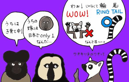 過ごしやすい秋の日曜日、小型サル舎でスポットガイドを行いました。小型サル舎では、11種類45頭のサルを飼育しています。すべてのサルについて話し出すとすごく時間がかかってしまうので、今回はそのうちの「キツネザル」と「サキ」にスポットを当てました。まずは、見たことのある方も多いと思われるワオキツネザル。名前の「ワオ」はビックリの「Wow!」の意味ではなく、「輪」の模様が「尾」にあるという意味です。ワオキツネザルの世界ではメスが群れのリーダーで、当園でも母親のオリーブが一番権力を持っているようです(我が家と同じだな~と呟くお父さんたち・・・ドンマイ)。そしてお隣は同じキツネザルの仲間のエリマキキツネザルがいます。大きな声で鳴くのが特徴で、この鳴き声で遠くにいる仲間とコミュニケーションをとります。そのため、1頭が鳴き始めるとたちまち大合唱が始まり、通りがかるお客様をびっくりさせています。