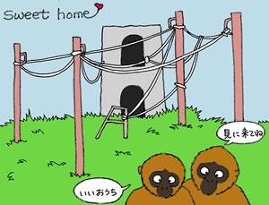 5月まで、この島で母親のハートと一緒に暮らしていた子供のハープ(オス)が旭山動物園へお婿さんとして旅立っていった後、久しぶりの夫婦水入らずの生活に戻りました。しかも、飼育担当者が新しく杭を立てロープを張りめぐらせたり、植栽を整備してくれて生まれ変わったクモザル島に。