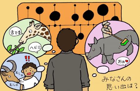 当園のキリン舎は、日本平の山の傾斜を利用し、キリンと同じ目線でキリンの採食風景を見られる、観察に適した造りになっています。子供の頃の私も興味津々で近くで見ていたのですが、葉っぱを食べているはずのキリンが、黒くて長いものをスルスルと飲み込んでいるではありませんか!「おとーさん、大変だ!キリンがヘビ食ってる!!」と大騒ぎし、親子で真偽を確認したところ、キリンがなが~い舌で葉っぱを絡めとって食べていただけなのでした。みなさんもぜひキリンの舌の長さと器用さを観察してみてください。