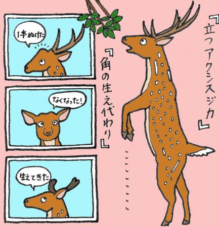 食事風景の後には、シカの角の生え代わり方を写真を使って紹介しました。角が生え代わるとき片方の角だけが残っている写真や、角が抜けた後から植物の芽が生えるようにニョキニョキと角が成長する様子などを参加された皆様にご覧いただきました。今は立派な角があるオスも、今号が発行された時にはもう抜け落ちてしまっているかもしれませんね。