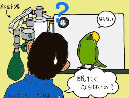 ある日、クチバシの伸びすぎたキビタイボウシインコのクチバシを切ろうと、麻酔用のハコにインコを入れ、麻酔をかけ始めたのですが・・・寝ない。全然寝ない。最初はこの子が麻酔にかかりにくい個体なのかと思いましたが、ついにはハコの中でバッサバッサ羽ばたく元気さ。これはおかしいと、麻酔器についているホースから匂いをかいでも、麻酔特有の匂いがしません。あれ~?と首をひねりながら、麻酔量の確認をしたり、バルブをいじったりしていると、やっと麻酔が出てきました。その後、無事に処置を終えましたが、これはまさか故障か⁉という疑いがあったため、メーカーさんに連絡し、機械の確認に来てもらうことにしました。