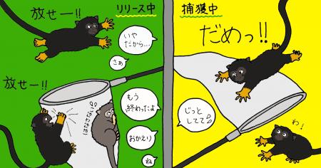 マイクロチップの挿入、性判別、体重測定を終えた子は未処置の子と混ざらないように、屋外の部屋にリリースします(捕獲は屋内と屋外の部屋を仕切って行います)。そこでまた一悶着。タモから出そうとする飼育員vsなぜかタモにしがみつくアカテタマリン&タモの中の個体を救出しようと飼育員に立ち向かう兄(今回の処置に関係ないので最初から屋外に隔離していました)。リリースするだけなのにてこずります。「だから返すって言ってるじゃん!」(この時飼育員が実際に言っていたセリフ)