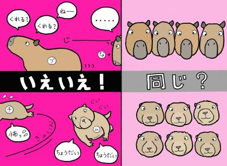 私は今年度から、ふれあい動物園で飼育しているカピバラとプレーリードッグの担当になりました。正直「パッと見みんな同じ顔じゃないか…」と思ってしまいました。どちらの動物もモルモットやウサギのように模様がはっきりしているわけではないですし、インコのように大きな声でよく鳴き、鳴き声に明確な違いがあるわけではありません。個体の特徴と行動から、時間はかかりましたがようやく見分けがつくようになった担当動物について、2頭ずつピックアップして紹介したいと思います。