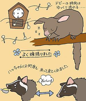 朝のおねだりがなくなり、だんだん食欲が落ちて・・その様子を観察していると、「ドビーは二日に一回目を覚ます」ことに担当飼育員は気付きました。一日が48時間になっているようです。確か、人間の長生きのおばあさんもこの周期で生活している方がいるとテレビで見たことがあります。