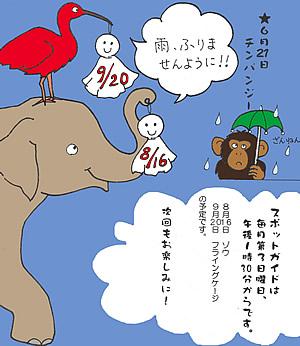 [一覧へ戻る] « 189号の5ページへ 189号(2009年08月)6ページ スポットガイドだより ★5月17日 動物病院 ★6月21日 チンパンジー なんと、二ヶ月連続で雨天のため中止になってしまいました。雨天の場合は翌週に延期という予定もたてているのですが、翌週までも雨・・ 新スポットガイド班長さん、雨男なのでしょうか? スポットガイドは飼育員が自分の担当動物の紹介をするイベントです。 生態について、個体の性格について、餌や毛やうんちなどの実物を見せたり、クイズなども行います。普段はいることのできない寝室などの見学もあります。 さて、次回の天気は・・良いことを願っています。 « 189号の5ページへ [一覧へ戻る]