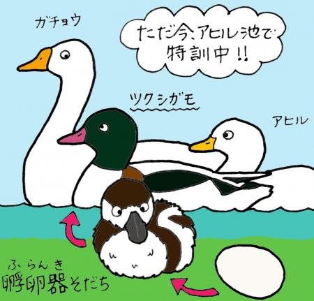 日本平動物園には、他にも3羽のツクシガモがいるんだけど、他の子たちはフライングメガドームで自由に泳ぎ回っている。なんでチビはアヒルたちに混ざっているのかな…?実はチビはこの春に飼育員の手で育てた、まだ子供のツクシガモなんです。ツクシガモは春に卵を産んで、お母さんが約1ヵ月も卵を温めて、赤ちゃんが産まれてきます。