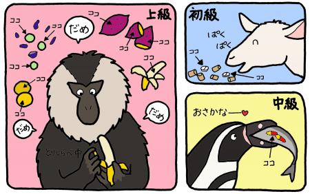 エントリーナンバー2:中級編のペンギンの場合。ペンギン達は餌の魚を丸呑みにする習性があります。そこで、魚の中に薬を詰め込んで与えれば、本人たちが知らない間にお薬が体の中に入ってしまいます。ペンギンの他にも、薬自体が見えないように大好物の肉や甘い煮イモ、バナナなどに挟めば食べてくれる動物たちもいます。ほんの少しの工夫が大事!ということで、これなら動物も人間も負担が少ないです。