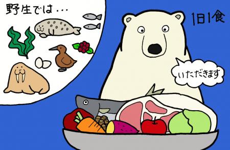 皆さんは日本平動物園のホッキョクグマの食事は1日何回だと思いますか?「ホッキョクグマほどの大きな体だったら1日3回、はたまた5回くらい食べるんじゃないか」、なんて来園者の方から言われることも多いのですが、実はそんなことはなく1日1回。肉、魚、野菜などをバランスよく食べています。肉(魚)だけでなく野菜も与えている理由ですが、ホッキョクグマは肉食の強い雑食性の動物で、野生では木の実など肉以外のものを食べることがあるためです。また野生での主食はアザラシです。アザラシのお肉は脂肪がたっぷり含まれています。それは彼らが住んでいるところが北極圏で、ものすごく寒い場所だというのが理由です。アザラシは脂肪をたくさん体に蓄えて寒さから身を守ります。そのアザラシを主食にしているホッキョクグマにとって、脂肪を摂取することはとても大事なことなのです。動物園ではなるべく野生に近い食事を目指しています。そのためホッキョクグマには脂肪の多く入った馬肉を与えています。皆さんの身近な肉でいうと豚のバラ肉に近い(もっと脂身がついています)ものです。この肉を当園のオスのロッシーで1回に10kgほど、メスのバニラでは5kg与えています。また魚を与える日は大きなブリをまるまる1尾、そこに脂肪分の魚油を与えています。