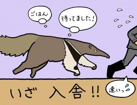 日本平動物園の飼育員として働き始めて14年が経ち、これまで多くの動物を飼育してきましたが、オオアリクイほど“お行儀が良い”といいますか“飼育員思い”だなと感じる動物はいなかったように思います。たとえば餌。他の動物ですと好き嫌いが多く、餌を選ぶのに苦労したり、十分に食べてくれなかったりして飼育員を悩ませることがありますが、オオアリクイは基本的には毎回残さず食べてくれます(幼い時の竹千代(オス)はなかなか餌を食べてくれず苦労しましたが、今ではちゃんと残さず食べてくれるようになりました)。また、入舎(外の放飼場から寝室へ戻すこと)の時、他の動物では時間になっても(時には夜遅くになっても)寝室に戻らず飼育員を心配させることが多々ありますが、オオアリクイは門(オオアリクイ舎の外の放飼場を半分に仕切る柵があり、柵の中央部分に門があります)を開けたら直ぐに寝室に戻ってきてくれます。入舎の時、オオアリクイたちはだいたい駆け足で戻ってくるので、私も門を開け部屋に戻る時は、追いつかれないように急ぎ足になります(オオアリクイはご存じのとおり、前あしにアリ塚を壊すための大きな爪を持っています。これを武器にして攻撃してくることがあるので、一緒の場所にいるのは結構危険なのです)。ちなみにこの入舎の時は、3頭いるオオアリクイたちの性格の違いが表れる場面でもあります。フジオ(オス)は、入舎の時刻が近づいてくると、門の前でソワソワしだし、あっちへ行ったりこっちへ行ったりするので、離れた隙を見計らって門を開けることが出来るので、私もそこまで急いで部屋に戻る必要はありません。フジオの場合、まっすぐ室内に戻ることもあれば、途中、土のにおいを嗅ぐなどちょっと寄り道をしてくることもあります。フジオの息子の竹千代も入舎の直前は門のあたりを行ったり来たりしますが、門が開いたら一目散に室内に向かってきます。それは駆け足なんてもんじゃなく猛ダッシュなのです。なので私も竹千代の時は全速力を出さなければいけません。ヒナ(メス)はどうなのかというと、オス2頭と違って、入舎の前は門の前からぴたっと動かなくなり、門が開く瞬間を今か今かと待ち構えます。まさに臨戦態勢という感じです。その姿はまるで、開店前の人気店に長い行列を作る熱心なお客様のようです。私もヒナの時は半身となって片腕・片足は部屋の方に向けて門の閂を抜く羽目になります。そんな私とオオアリクイたちの追いかけっこは来園者の皆さんにはどう映っているのでしょうか?飼育員がオオアリクイから必死で逃げているようで滑稽に見えるかもしれませんが、こちらは至って真剣なので、そこのところご理解いただけますと幸いです。