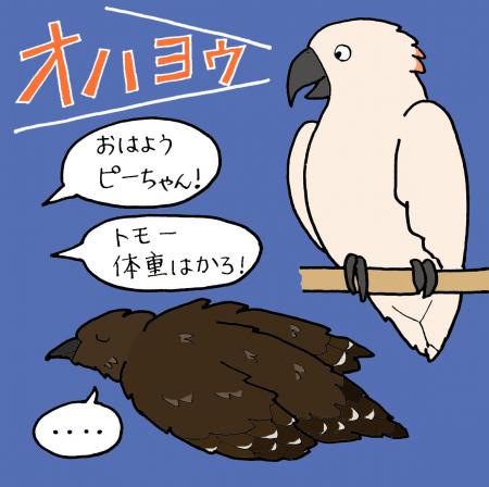 そんなトモとは正反対の鳥が、今年の4月にやってきたオオバタンです。オオバタンは元々いた施設での愛称が「ピーチ」のため、病院ではピーちゃんと呼んでいます。ピーちゃんが病院にやってくる前にいただいた個体情報には、人間に対しての好き嫌いが激しい、よく喋る(ハロー、オハヨウなど)、人の肩や腕に乗るのが好き、噛むことがある、と書かれており、どんな子が来るのだろうと楽しみな反面、あの強そうなくちばしで噛まれたら絶対痛いだろうなと思っていました。いざ初めましての日、まだ新しい環境にも慣れていないだろうから、部屋の掃除はあまり時間をかけずにやって、スッと部屋を出ようと思いながら掃除をしていると、頭上の止まり木から「オハヨウ」と聞こえました。思わず顔を上げて「おはよう」と返し、感動したのを覚えています。次の日同じく掃除に入っていると、近くの網に掴まってこちらを見ており、腕に乗るのが好きと書いてあったのでもしかして乗りたいのかなと思い、噛みそうな仕草をしたらすぐ離れようと少し警戒しながら腕を近づけてみると、すんなりと腕に乗ってきてくれたのです。「お、乗ってくれた」と思ったのも束の間、肩へ移動し、顔まで近づいてきてほぼゼロ距離でこちらを見てきました。とにかく近い。「近いな…」と内心ドキドキしながら掃除を終わらせ、止まり木に帰ってもらいました。ひとまず嫌われていないようでよかったと安心しながら、前の施設で愛されていたんだなとほっこりしました。