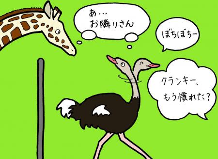 前のダチョウ舎では、室内よりも外が好きでなかなか入ってくれませんでしたが、今のダチョウ舎では最初のうちは安全なのは室内と思っていたようで、「ダイヤ」が近くにいるときは絶対に放飼場に出ない引きこもりのようになっていました。最近では慣れてきたので、ダイヤが近づいてきても、あまり気にせずに毎日楽しそうに外と室内を行き来しています。クランキーは人も好きでたくさんの方が声をかけてくれることがうれしいようなので、ぜひ新しいダチョウ舎でもクランキーをかわいがってもらえたらと思います。