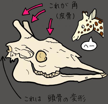 ガイドで多くの時間を割いて語らせていただいたのが「角」の話。みなさん、キリンの角の数はいくつだと思いますか?2本?3本?5本?わかりやすいのが頭のてっぺんに生え2本の角ですね。それと、おでこにある大きな瘤も角として数えます。この3つの角は、「皮骨(ひこつ)」と呼ばれていて、皮膚の中から生み出される骨で、頭骨とは由来が異なります。成長とともにこの皮骨が大きくなり、最終的に頭骨と一緒になるのです(癒合【ゆごう】といいます)。よーく骨を観察すると角と頭骨の境目があることがわかります。生きている姿では見つけにくいことも、骨にするとわかりやすくなる。これも骨格標本の面白さであります。ちなみに後頭部に小さめの瘤が2つあり、これも角と数え「キリンの角は5本」と紹介されることが多いですが、この後頭部の瘤は、他の3本と異なり皮骨ではなく、頭骨の一部が変形したものです。他の3本とは由来が異なるため、角としては数えないそうです(参考「キリン解剖記(ナツメ社サイエンス)郡司芽久」)。みなさんも「キリンの角は3本」とぜひ覚えてくださいね。