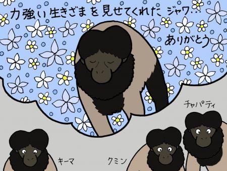 日本平動物園ではジャワの息子たちのクミンとチャパティが展示場で皆さんをお待ちしています。ジャワ、まだまだ健在なキーマと子どもたちを天国から見守っていてね。