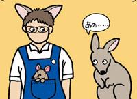 ★7月18日 オグロワラビー 暑さのためか、参加の呼びかけになかなか立ち止まってくれず心配しましたが、それでも開始直後から徐々に参加者が増えはじめ、用意したベンチが一杯となる盛況ぶりでした。担当の佐野彰飼育係員が、手作りの尻尾、ポケット付きのエプロン、耳等を身にまとい、ワラビーになって説明をしました。出産から成獣となるまでの過程を写真パネルで解説したり、生まれたての赤ちゃんや生後2、3ヶ月令の子供の実物標本等を見せながらの説明には、皆興味津々でいつまでも見ていました。最後には、佐野君が身につけていたワラビーのコスプレを希望者に着てもらっての記念撮影も行いました。