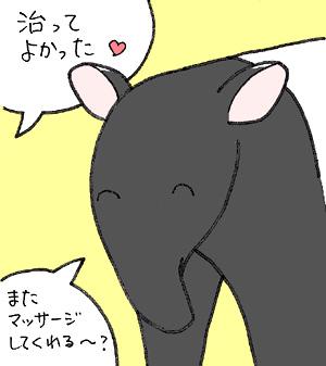 「ごめんね、でもシンのためだからね」ところが、このシンくんは本当に性格の良いオスで、注射直後に針を抜く際、「えらいね、よく頑張ったね」と言いながら身体を触ると、「マッサージしてくれるの〜」と思うのか、すぐに腰を落として寝るのです。痛みはすぐ忘れてしまうのか、自分のためとわかって耐えてくれたのか、はたまた単にマッサージされるのがたまらないのか・・・真相はわかりませんが、シンの穏やかな心の広さを感じる場面でした。