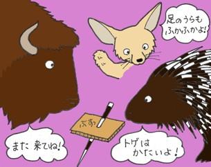 そして、嗅覚や聴覚もとても優れています。今現在の飼育数は十三種類います。この中から二種類の動物、ひとつはアフリカタテガミヤマアラシ、そして、もうひとつはフェネックギツネを紹介しました。