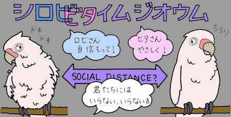 さて、前置きが長くなってしまいましたが、インコ担当の現在の課題についてお話したいと思います。2020年3月末、当園で飼育されているシロビタイムジオウムのビタ(雌)のお婿さんとして、他園からロビ(雄)がやってきました。最初はビタがいる部屋に、ロビが入っているケージを置いていました。前インコ担当の先輩から、ビタとロビの同居訓練についての引継ぎを受け、獣医と相談し4月中旬に1回目の訓練を実施しました。何かあってもすぐに対処できるように、獣医同伴の元30分ほどロビのケージを開放し、2羽の様子を観察しました。1回目は、ロビが室内の空間に慣れておらず、ぎこちない姿を見せながらも無事に終了する事が出来ました。そこから数回は、一緒に餌を食べていたり同じ止まり木に止まっていたりと問題は無いように思われました。しかし、ある日突然ビタはロビを追いかけ回すようになりました。ロビは来園した時から羽がちゃんと生えておらず、飛ぶことができません。その為、ロビの逃走手段は走ることしかできません。ビタが近づいてくると、怖がってしまい、木から落下してしまう事もありました。それを境に訓練中2羽は一定の距離を保つようになりました(そこでソーシャルディスタンスはいらないから!)。現在は、ロビの羽を生やし翼の筋肉をつけることを優先し、訓練は行っていません。隣の部屋で飼育し、お見合いだけ行っています。時間をかけて同居できるようにしたいと思います。ロビもっと自信もって!ビタ優しくなって!