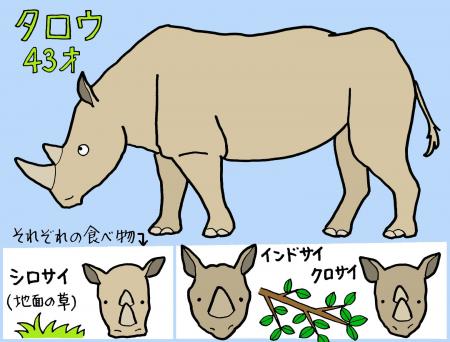 今年度からシロサイ担当になりました飼育員の高田です。よろしくお願いします。はじめに簡単にタロウの紹介をさせて下さい。タロウはオスで1982年生まれの43才、日本の動物園で飼育されているシロサイの中では最高齢です。人間の年で例えると80才を越えます。性格は穏やかで、餌を食べる事、身体をデッキブラシでブラッシングをしてもらうのが大好きです。今回はタロウを通じて簡単にシロサイの紹介をしていきたいと思います。
