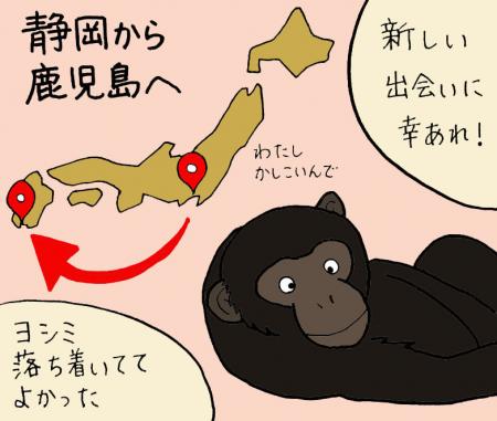 移動中の休憩時にはほとんどのお弁当を食べてくれていたようで、平川動物公園でも部屋に入って落ち着いた様子を動画で送っていただいてとても安心しました。これから初対面のチンパンジーたちと同居が始まり大変なこともあると思いますが、平川動物公園にはチンパンジーの子どもが3頭もいて、子ども好きなヨシミにとっては楽しいことも多いのではないかと思います。自分が担当になるずっと前から日本平動物園にいたヨシミがいなくなるのはさみしいことですが、繁殖目的の移動なので子ども好きなヨシミに赤ちゃんが生まれたら嬉しいです。平川動物公園は鹿児島県にあるのでちょっと遠いですが、皆さんにもヨシミや日本平動物園のチンパンジーたちの今後をあたたかく見守ってもらえればうれしいです。