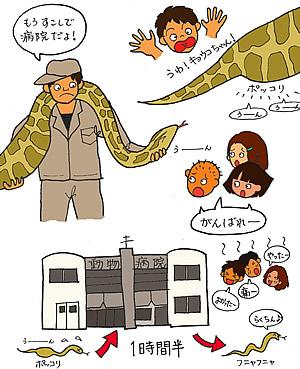ふだんほとんど動きのみられないニシキヘビの異変を見つけるのは難しいことです。手遅れにならず発見できたのは飼育員さんの観察力があってこそ。長時間おしりに手を突っ込まれ、大きなウンチをかきだされたキョウコちゃんのツチノコだった部分はフニャフニャですがまだゆるんだまま。