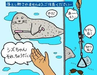 しかしここ半年の間で、爪切りよりも困難なアザラシ系ミッションがくだされました。それも2回。どちらも「来園者の落とし物を速やかにプールから回収せよ」というものでしたが、驚いたのはどちらも「二階テラスから円筒水槽の中に落とした」ということでした。つまり、一階の最ボトムにブツがあるということです。一回目はサングラス、二回目は自撮り棒(携帯電話でセルフィー撮影するための道具)でした。サングラスはレ〇バン製の高価なものらしく、「回収したら連絡ください」と連絡先を残して落とし主は立ち去り、自撮り棒は「大した物じゃないのでいいです」と言って落とし主は立ち去ったそうです。しかし、どちらもアザラシにとっては見たこともない異物。天の恵みとばかりに、万が一食べてしまったりしたら大変です。という訳でどちらの日も、出勤日にドンピシャ当たっていた「アザラシにまたがる男」が無線で呼ばれました。