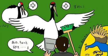 手元のデッキブラシとチリトリを使い、ブラシの柄で『ずわい』のつつき攻撃をさばきつつ、チリトリで『いなり』を牽制し、少しずつ前に進んでいきます。ここで、レストハウスの職員さんから「なにしてるんですか?」という質問を受けましたが余裕がありません。攻撃をかわしながら「えっと、あの、ちょっと・・・卵を」と答えるのが精一杯でした。(後できちんと説明しました)そしてついに、なんとか目的の卵までたどりついたところでひとまず本物を避難させ、ポケットからタンチョウたちに見えないよう擬卵を取り出し、すり替えたと気づかれないよう体の後ろで交換し、元の位置に擬卵を置くという白目をむいてしまいそうな作業を行いました。タンチョウたちも、卵が元の位置にあり、私が後退したので「撃退した」と思ってくれたのか、鼻息荒く勝ち誇っているように見えます。私は心の中でタンチョウたちに「ごめんな」と謝りながら、獣舎を後にしたのでした。