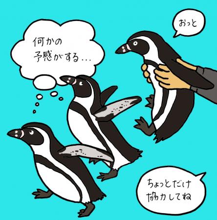 作戦決行日は11月の休園日に決まりました。開園日のプールに水が入っている状態だと、ペンギン達がすぐプールに飛び込んでしまい、捕まえるのも一苦労です。その点、休園日は展示場のプールの水を抜いて掃除するので、捕まえるには絶好の機会です。かわいい走り方で逃げ惑うペンギンたちを飼育員が素早く捕獲してくれました。