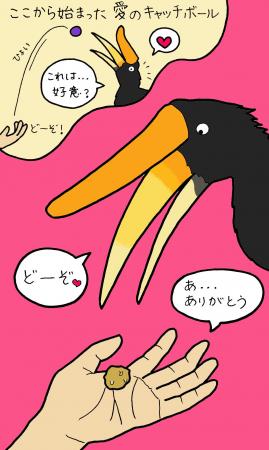 このキャッチボールはサイチョウの好意を示す行動である「餌のプレゼント」に当てはまったようで、しばらくするとナナミから餌を渡そうとしてくるようになりました。