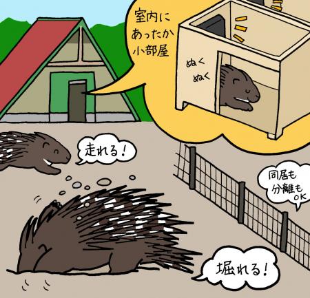 また、ヤマアラシは寒さにもある程度強いのですが、2頭は暖房のよく効いた夜行性動物館で暮らしてきたため、いきなり寒い屋外に放り出されれば、体を壊しかねません。そのため、室内にヒーター付きの小屋を設置することで暖を取れるようにしました。