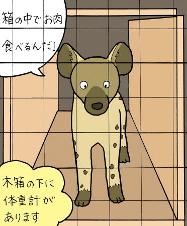 しかし次に担当したブチハイエナではそう簡単にはいきませんでした。ハイエナは家畜のポニーと違い、同じ空間に入ることも手綱を引くこともできません。さらに鋭い歯と強力な顎を持つ彼らに壊されないよう、体重計を工夫して設置する必要がありました。悩んだ挙句体重計が隠れつつもハイエナが通路から入ればそのまま測定できるような箱を作ることにしました。もちろん体重計に乗っている間はご褒美のお肉がもらえる構造です。結果的にこの方法で測定はできましたが問題がひとつ。セッティングがまぁ大変なのです。ポニーの時と同じスケールバーを使ったのですが、これがそこそこ重く、ハイエナ舎の階段を上り下りして運ぶのは一苦労。さらに箱の構造上、設置に10分近くかかります。そこで次は大型犬用の体重計を導入しました。これは置くだけで測定でき、準備も30秒ほどで完了します。とても楽なのですが、ハイエナから丸見えなのでオモチャと認識されたら一巻の終わりです。そのためダミーの体重計でトレーニングを重ねたり、周囲を木枠で囲って噛みにくくしたりと工夫を重ねました。その甲斐あって、私が担当を離れる頃には安定して測定できるようになっていました。めでたしめでたし、です。