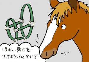 ウマの担当になったとき、まず最初に立ちはだかったのが無口(むくち)という馬具です。犬で例えると「首輪」に近い役割ですが、ウマは体が大きくて首も太いので、首ではなく頭につけます。担当してはじめの2~3日は、無口をつけようとすると、ウマが首を振る・・私が右往左往する・・踏み台を持ってきて再チャレンジする・・ウマが再び首を振る・・私は諦めて他のスタッフを呼びにいくという流れ。当のウマ、レベッカ(♂)は無口ひとつ着けられない私に対して「キミ、落ち着けよ」という顔。ぐぬぬ・・その余裕を分けてほしいよ、レベッカ!!